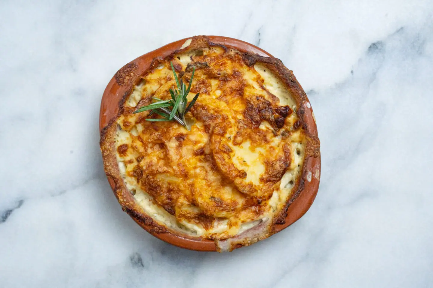 We koken de aardappels en laten deze afkoelen. Hier worden dikke plakken van gesneden en samen met room culinair, knoflook, peper, zout, rozemarijn en tijm in een vacuüm zak gestopt. Dit gaat in de steamer voor 20 minuten zodat alle smaken goed kunnen intrekken. Wanneer het afgekoeld is verdelen we deze over de oven bestendige bakjes. We gebruiken gemalen boerenkaas voor het gratineren en gaat het nog een 40 minuten in de oven.Thuis kunt u deze opwarmen op 140°C voor 25 minuten.