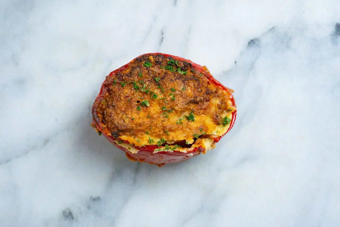 De paprika’s worden kort gestoomd in de oven, tot ze een zacht bite hebben. Voor de vulling gebruiken we rundergehakt wat op smaak is gebracht met peper en zout. We maken de saus van tomatenpuree, Italiaanse kruiden, melk, uien, knoflook en gedroogde oregano. We vullen de paprika met het rundergehakt en schenken de saus in de bak. De paprika’s worden afgetopt met gemalen kaas en het word afgebakken in de oven. Thuis kunt u de paprika’s warm maken in de oven op 140° graden voor 30 minuten.