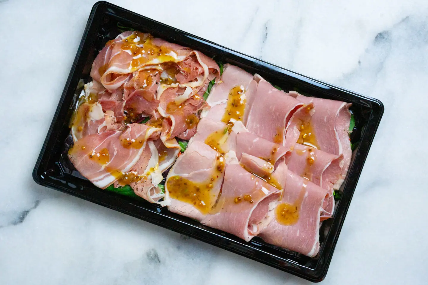De volle, licht zilte smaak van de gedroogde ham en de zachte, sappige structuur van de gekookte variant vormen samen een mooie balans. Afgemaakt met een huisgemaakte honing-mosterd dressing die zorgt voor een subtiele zoet-pittige twist.