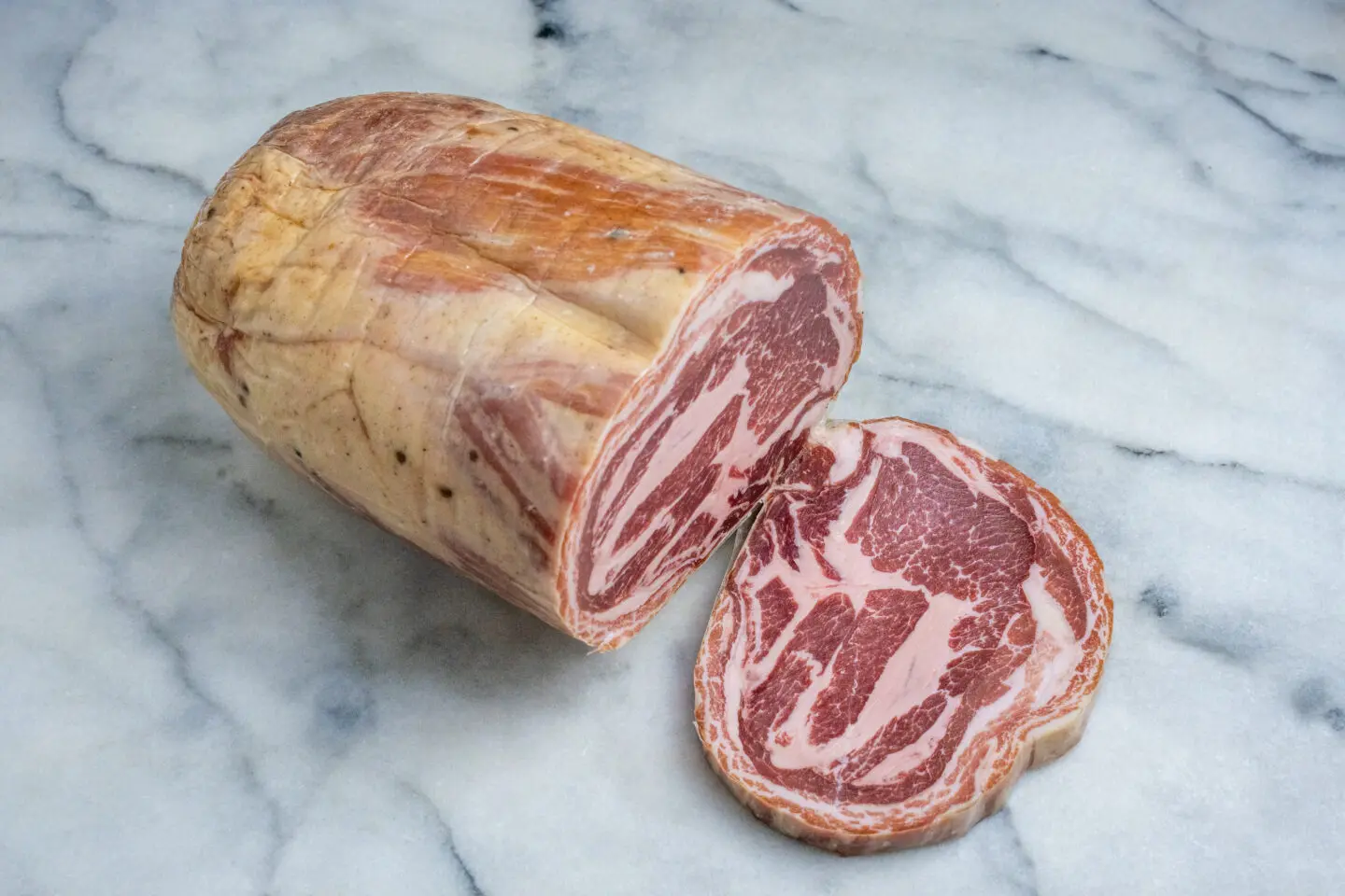 Pancetta Coppata is heerlijk, want het komt van de varkens nek die omwikkeld is met varkensbuik een mals en smaakvol stuk vlees. Gezouten, daarna rustig 8 weken gedroogd. Zeer geschikt voor vis en vlees om mee te omwikkelen en rustig garen in de oven. Onmisbaar voor de pasta schotels. Even aangeven welke dikte het mag gesneden worden op de snijmachine.