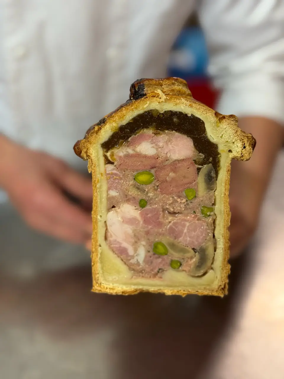Paté en Croûte, ook wel paté in korst genoemd. Deze is gemaakt met kalfslever, kalfsvlees en herfst paddestoelen. De paté wordt op smaak gebracht met oregano, tijm, jeneverbessen, sjalotten, knoflook en rode port. De ovenpot wordt bedekt met een speciaal deeg dat ervoor zorgt dat de paté niet uitdroogt. Het deeg maakt de paté weer net een beetje anders en zorgt voor een volle smaak. Verwarm de paté voor 4 minuten op 140°C in de oven. Erg lekker als voorgerecht of voor bij de borrel!
