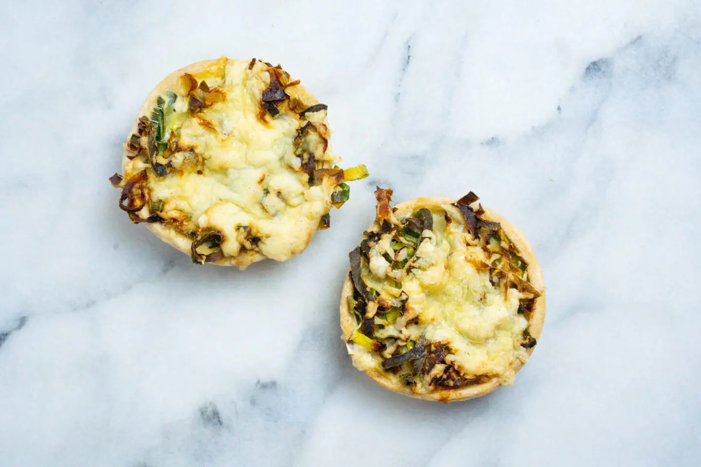 Voor de quiches gebruiken wij de quiche deeg vormpjes van PIDY, dit is een groot familie bedrijf dat in 1950 is opgericht en sindsdien aan de grootste bedrijven wereldwijd bladerdeeg producten levert. We gebruiken onze eigen achterham, deze word in kleine blokjes gesneden, zonder vet en die vormen de eerste laag. Hier overheen komt de verse prei en gemalen boeren graskaas. Voor de binding nemen wij eieren, room en melk. Dit wordt goed geklopt en wordt over de quiches geschonken. De grote quiches gaan voor 25 minuten op 140° graden om te garen. Thuis kunt u deze opwarmen in een voorverwarmde oven op 140° graden voor 15 minuten.