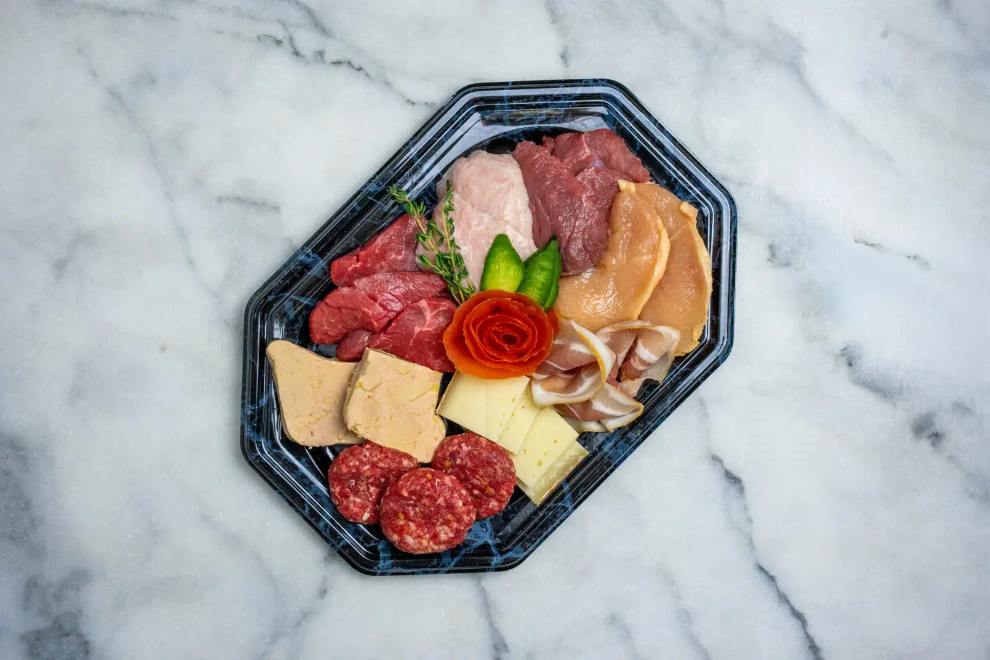 Bij ons kunt u uw eigen vleesgourmet samenstellen. Zo kunt u denken aan lamscarré, ossenhaas, kalfs zwezerik, verse eendenlever, ontbijtspek, raclette kaas, mais kipfilet, mini hamburgers etc. De keuze is volledig aan u. Schrijf bij kopje opmerkingen de vleessoorten die u wilt