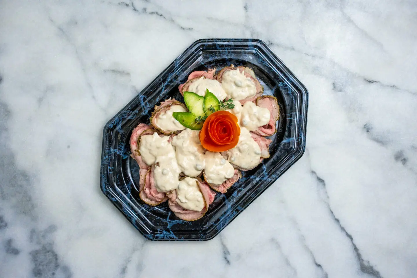 Voor de gebraden kalfsfricandeau gebruiken wij de rib eye en het verlengde hiervan. Dit is een doorregen deel van het kalf met een mooie vlees/vet verhouding. Het vlees wordt ingewreven met onze Teekens’ Schotse kruiden en vervolgens rosé gebraden tot een kerntemperatuur van 52°C. Het vlees wordt op deze lage temperatuur gegaard omdat het dan sappig blijft en zijn malsheid behoudt. Goed te gebruiken als voorgerecht in vitello tonato. Of zo uit het vuistje als aperitiefhapje.